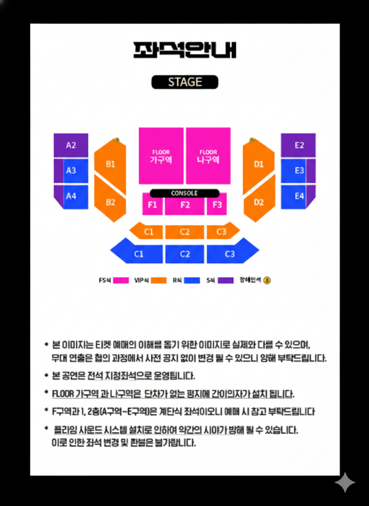 Q. FS석(Flying Sound System SEAT)은 일반 좌석과 무엇이 다른가요? A. FS석은 이승철 콘서트만의 시그니처인 입체 음향 시스템의 효과를 가장 최적으로 느낄 수 있도록 특별히 설계된 좌석입니다. 음향 설비가 공중에 매달려 소리가 입체적으로 전달되며, 일반 좌석보다 더 현장감 있고 폭발적인 라이브 사운드를 경험할 수 있습니다. 라이브의 전율을 온몸으로 느끼고 싶다면 FS석을 추천합니다.